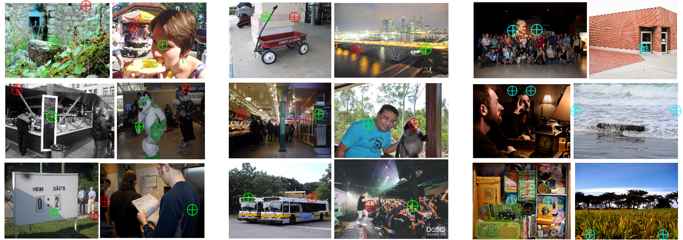 Figure 1: Example images and annotations. Green points are those annotated as closer in depth.
